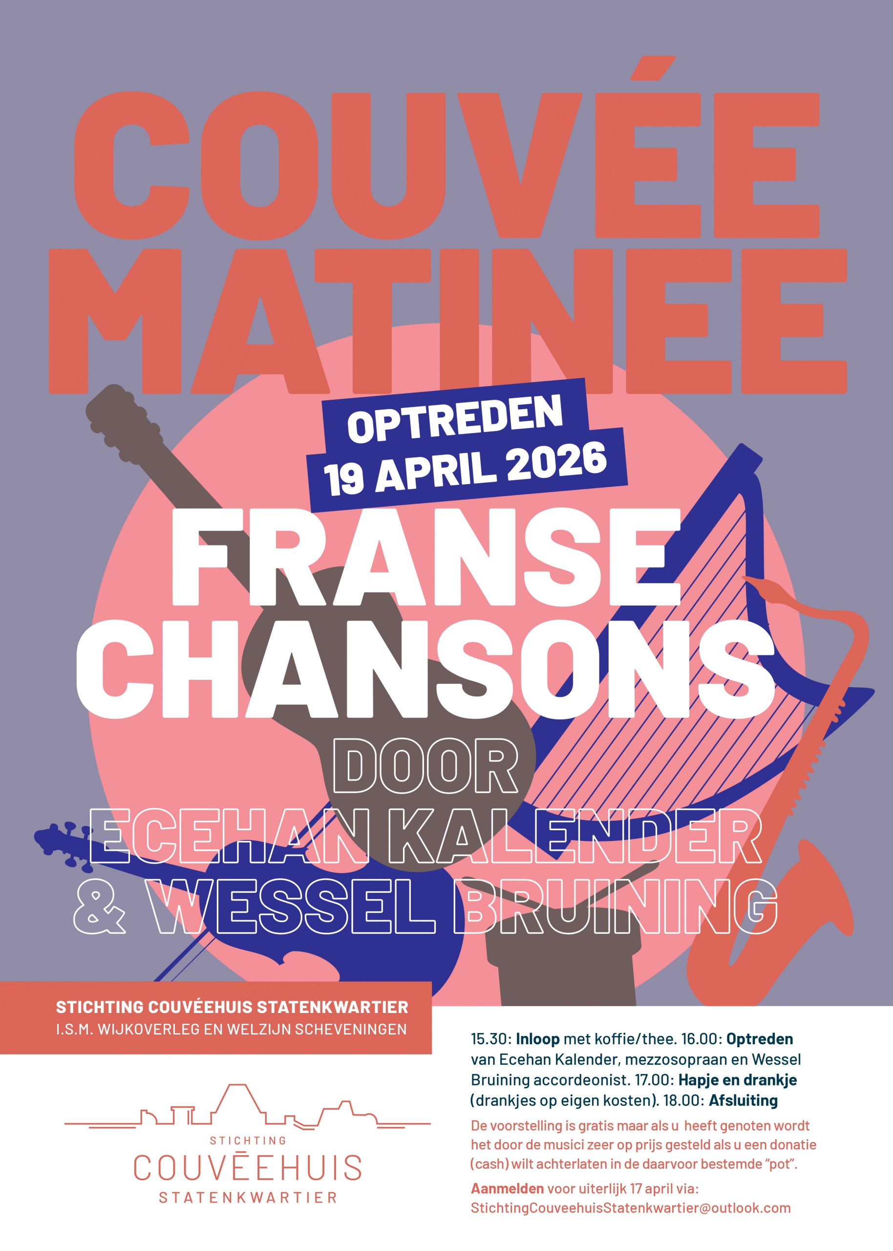 Stichting Couvéehuis Statenkwartier organiseert i.s.m. Wijkoverleg Statenkwartier en Welzijn Scheveningen een muzikale middag! Deze keer brengen Ecehan Kalender (mezzosopraan) en Wessel Bruining (accordeon) een sfeervolle mix van Franstalige chansons — denk aan Edith Piaf, Tino Rossi, Kurt Weill en Georges Bizet.