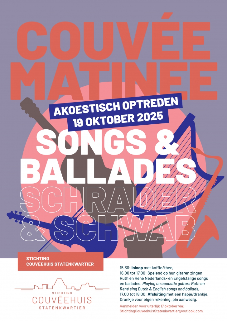 Stichting Couvéehuis Statenkwartier organiseert i.s.m. Wijkoverleg Statenkwartier en Welzijn Scheveningen een muziekale middag! Deze keer verzorgen Ruth Schrader en René Schwab een akoestisch optreden.