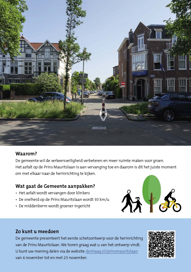 De gemeente presenteert het eerste schetsontwerp voor de herinrichting van de Prins Mauritslaan. Kom meepraten over een verkeersveilige en groene straat en deel jouw ideeën en aandachtspunten. We horen graag wat je van het ontwerp vindt. Je kunt jouw mening delen via de website denhaag.nl/prinsmauritslaan van 6 november tot en met 23 november.