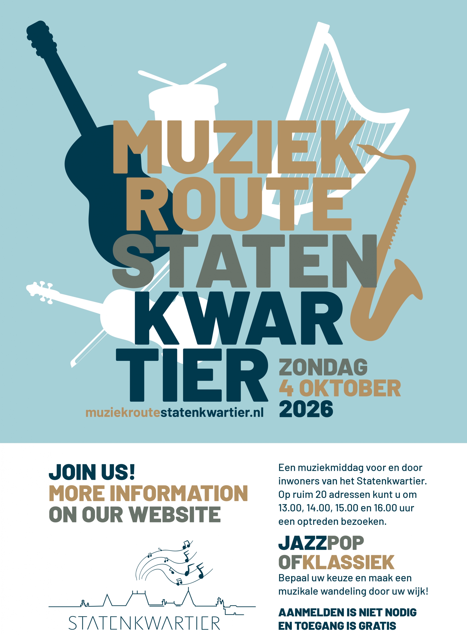Na de succesvolle editie van 2024, waarbij ruim 500 bezoekers verspreid over 29 huizen genoten van een middag vol muziek, staat de Muziekroute Statenkwartier gepland voor 4 oktober 2026. De tweejaarlijkse muzikale wandeling door onze wijk is een geliefde traditie: huiselijk, laagdrempelig en altijd vol verrassingen.