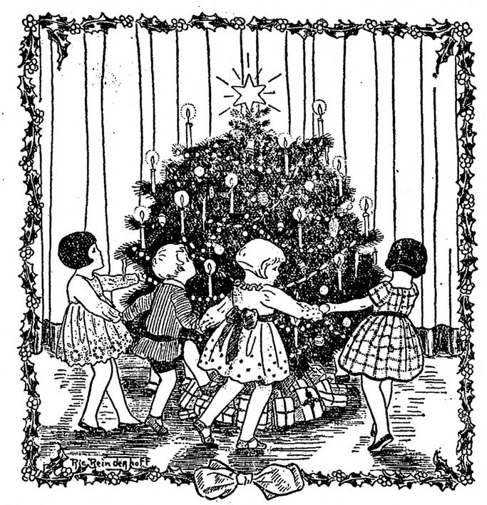 “Noël, Christmas en Weihnachten nemen in de naburige landen het geheele openbare en gezinsleven in beslag,” constateerde Het Vaderland in 1927 daags voor kerst in een artikel op de voorpagina. “In ons land zweert de meerderheid nog bij St. Nicolaas. Toch valt niet te ontkennen, dat in ons land meer en meer ‘aan Kerstmis gedaan’ wordt, dat niet alleen meer Kerstboomen, hulst en mistletoe onze huizen sieren, doch ook het geven van geschenken meer in zwang komt.” Bij het artikel was een tekening geplaatst van de toen populaire illustratrice Rie Reinderhoff [zie hieronder]. Dat kinderen een rondedansje om de kerstboom doen, zal ook toen echter weinig zijn voorgekomen. Maar dat het kerstfeest sinds de jaren 1920 uitbundiger in Nederland gevierd werd dan voorheen staat wel vast.