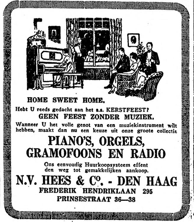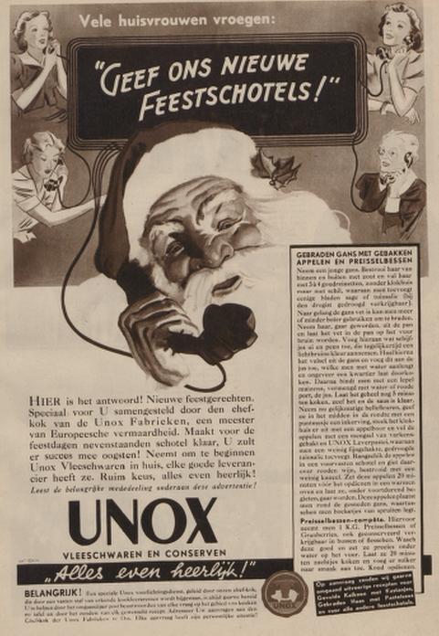 Uit advertenties in de kranten van toen blijkt die hang naar verlokkingen buiten de deur in de feestmaand echter wel mee te vallen. Daarin lijkt eerder het knus thuisblijven te worden aangemoedigd. Als voorbeeld hiervan kunnen twee advertenties uit Het Vaderland gelden – eentje van muziekhandel Hees op de Frederik Hendriklaan nr. 295, de ander van bakkerij Paul C. Kaiser, die vroeger jarenlang een filiaal had op nr. 86. Het zou trouwens nog lang duren alvorens het fenomeen kerstman in de Nederlandse reclame een rol begon te spelen. Zijn entree in dat opzicht lijkt van 1937 te dateren via een advertentie van Unox, die in december in veel kranten verscheen. De ontwerper ervan schijnt duidelijk geïnspireerd te zijn geweest door de figuur van de kerstman, zoals die in 1931 gestalte kreeg bij de Amerikaanse frisdrankfabrikant Coca-Cola en diens beeldvorming vervolgens wereldwijd heeft bepaald. Ook het telefoongebruik in deze advertentie wijst op een Amerikaanse navolging. Rond die tijd beschikte namelijk slechts circa 15% van de Nederlandse huishoudens over zo’n apparaat. Want dat was hier in die dagen nog echt een luxeproduct.