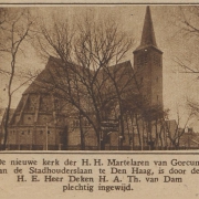 Eén der kerken, waarop werd gedoeld, was die van de Heilige Martelaren van Gorkum. (De andere twee waren de St. Josephkapel in de Bevelandsestraat en de kerk van Onze Lieve Vrouw van Lourdes aan de 2e Messtraat; geen ervan is tegenwoordig nog in gebruik.) De parochie van dezelfde naam was in 1916 ingesteld en besloeg behalve onze wijk ook nog het Geuzenkwartier en enkele straten in Duinoord en Zorgvliet. De aanwas van het aantal katholieken in de omgeving en de beperkte ruimte die het (toenmalige) kerkgebouw van de Heilige Antonius Abt aan de Scheveningseweg bood, hadden er voordien al toe geleid om aan de Van Beverningkstraat een houten hulpkerk in gebruik te nemen. Onder leiding van de bekende architect Nicolaas Molenaar sr. was de bouw ervan in 1912 binnen drie maanden geklaard. De komst van dit kerkje, uitgevoerd in modern-Romaanse stijl, betekende voor vele gelovigen ook een fysieke verlichting. Want zoals het dagblad De Tijd in die dagen opmerkte: “Er waren parochianen van Scheveningen, die bijkans een half uur moesten loopen om hun kerk te bereiken.”
